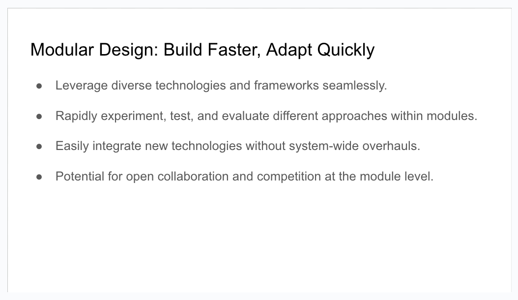 "This modular architecture isn't just about flexibility - it's about enabling a new paradigm for AI innovation. Each module accepts structured inputs and produces structured outputs, creating clear interfaces where teams can plug in their preferred approaches. This means you can rapidly experiment with different technologies, frameworks, or entirely new approaches without rebuilding the whole system.