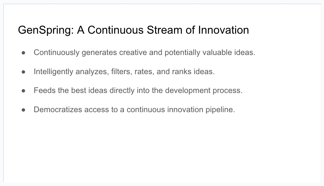 - GenSpring - The Idea Engine: This is where things get really exciting. The most innovative modules is called GenSpring, which is designed to continuously generate new ideas, evaluates them, and feed the most promising ones into the development pipeline through all the other modules. It’s like having a perpetual brainstorming machine!