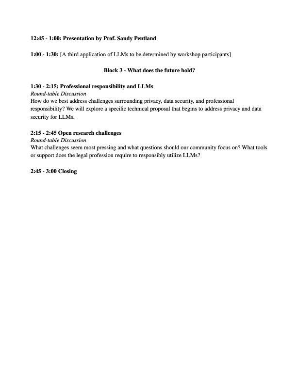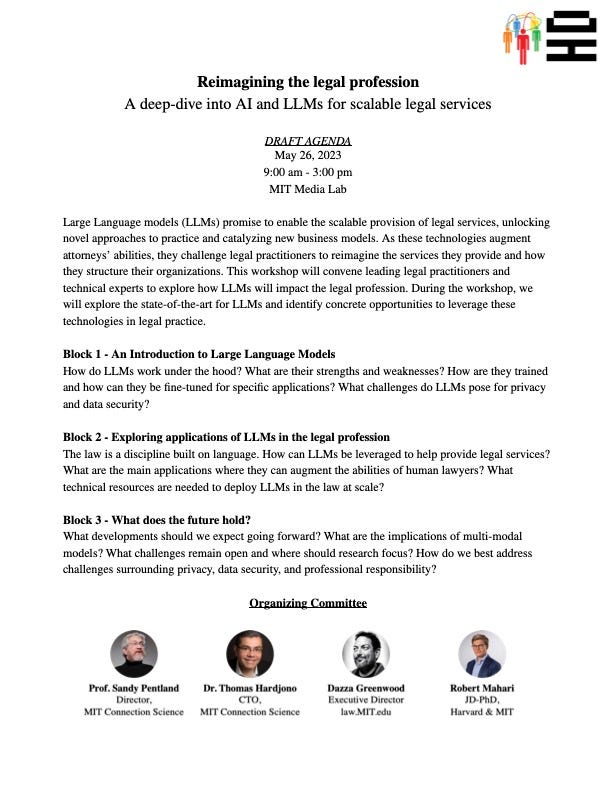 I'm excited to share some highlights from the recent workshop hosted by MIT Media Lab, focusing on the application of Large Language Models (LLMs) in the legal field. Held on May 26th, 2023, this event brought together experts from MIT and the legal profession to explore the potential of LLMs and discuss responsible AI usage in the legal profession.