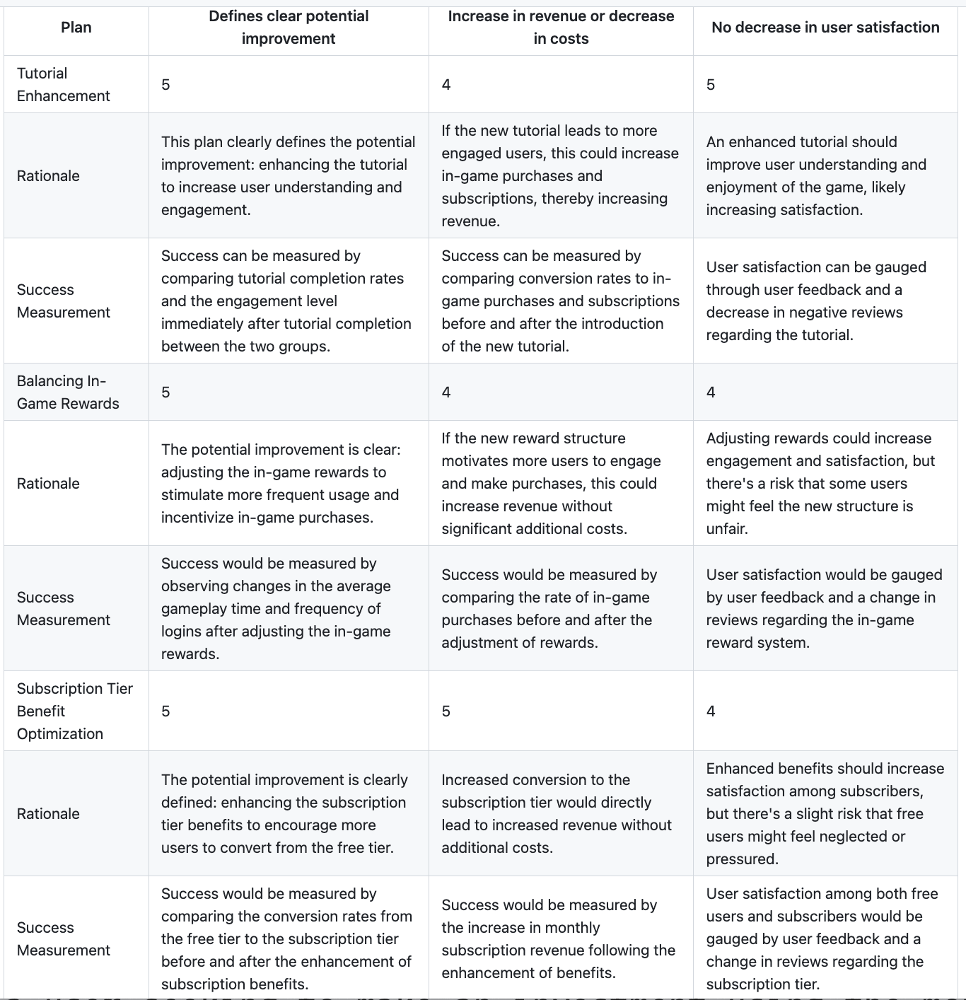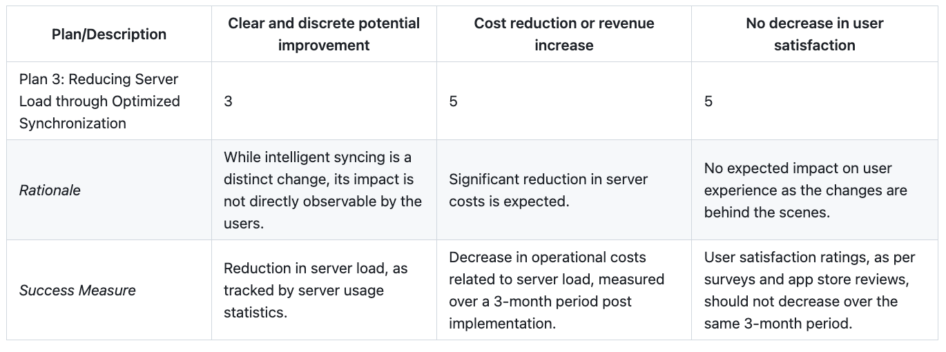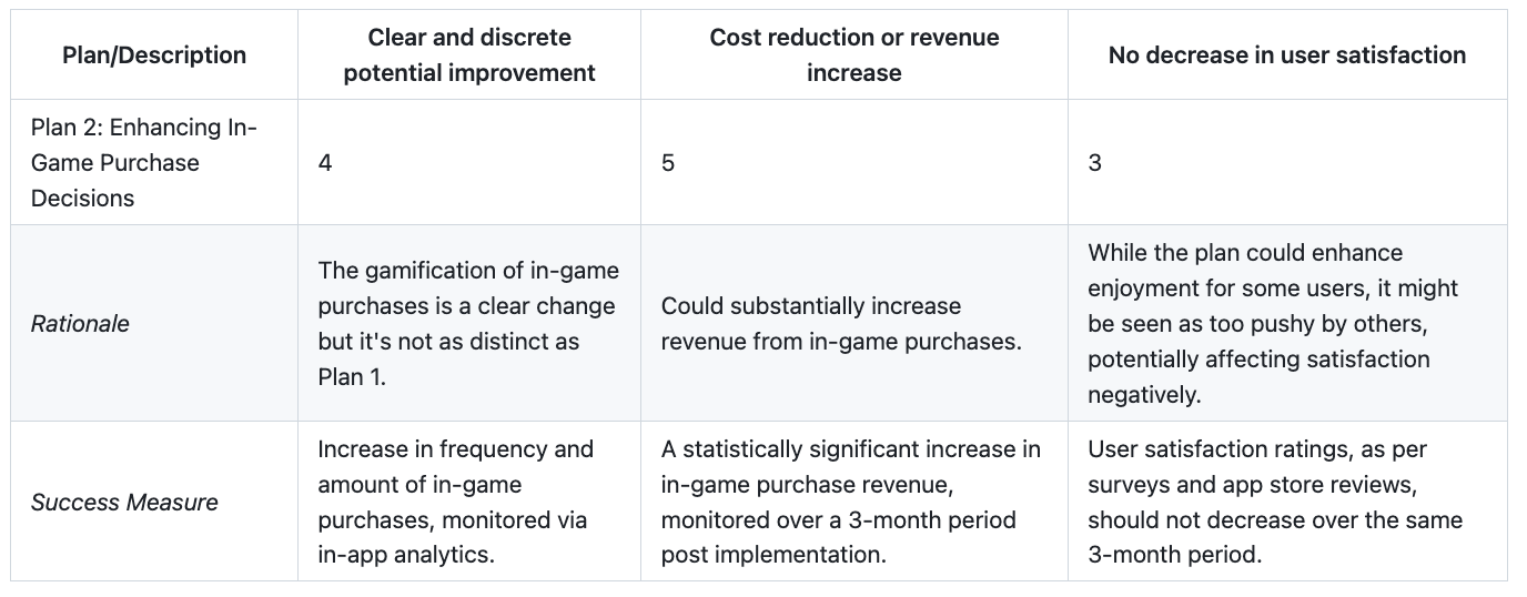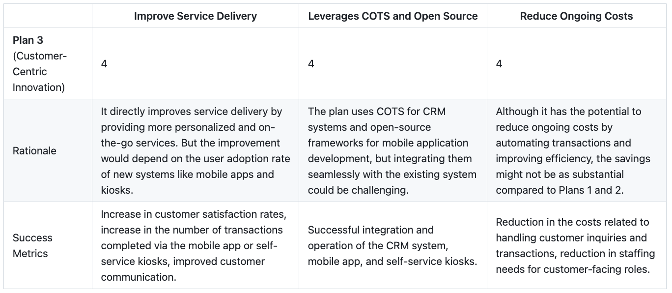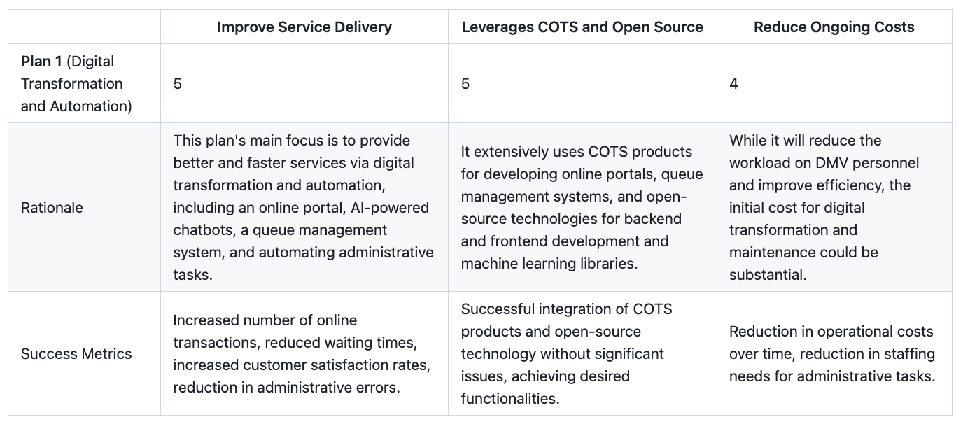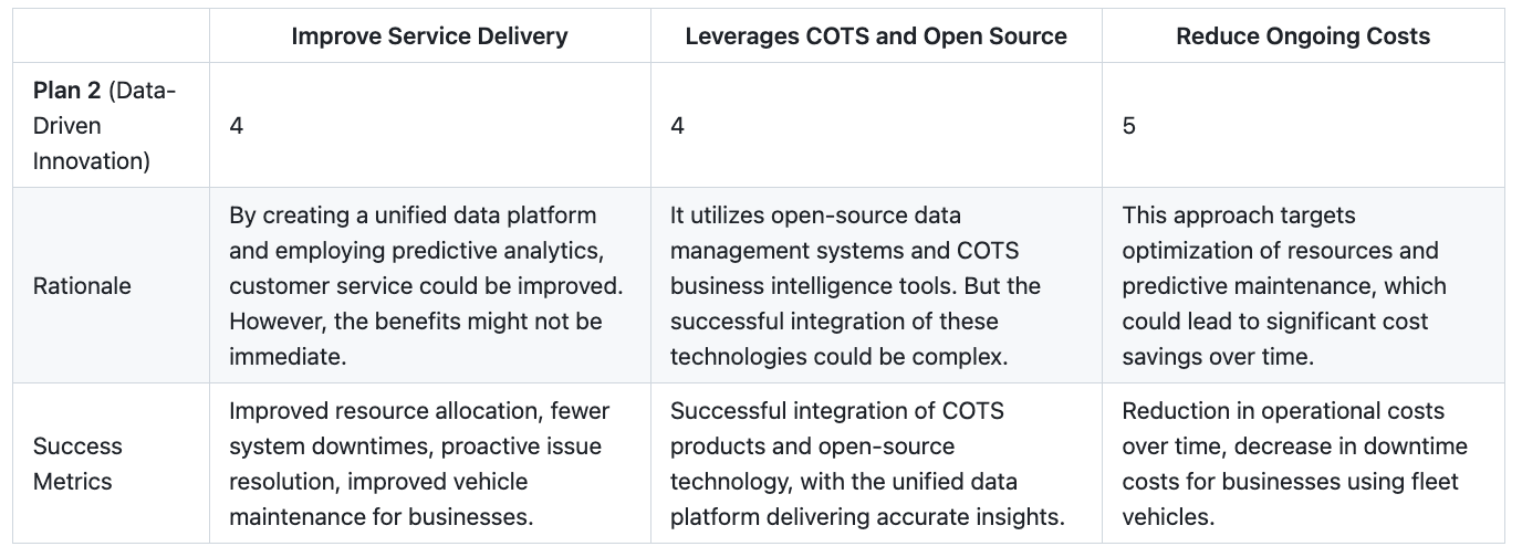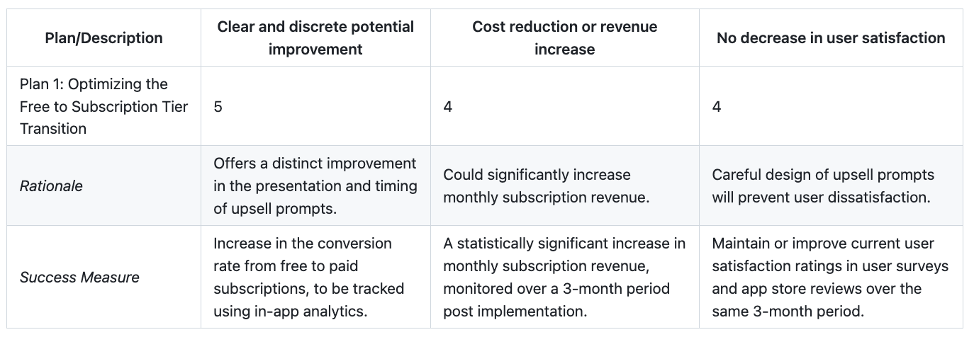 Prompt 2: Rate each plan against each of the three success criteria. Display in a single markdown table with rows for each plan and columns for each success criteria. Rate from 1 (lowest) to 5 (highest). Include a row below each plan to describe the rationale for each rating. In a row below the rationale, describe how success would be measured.